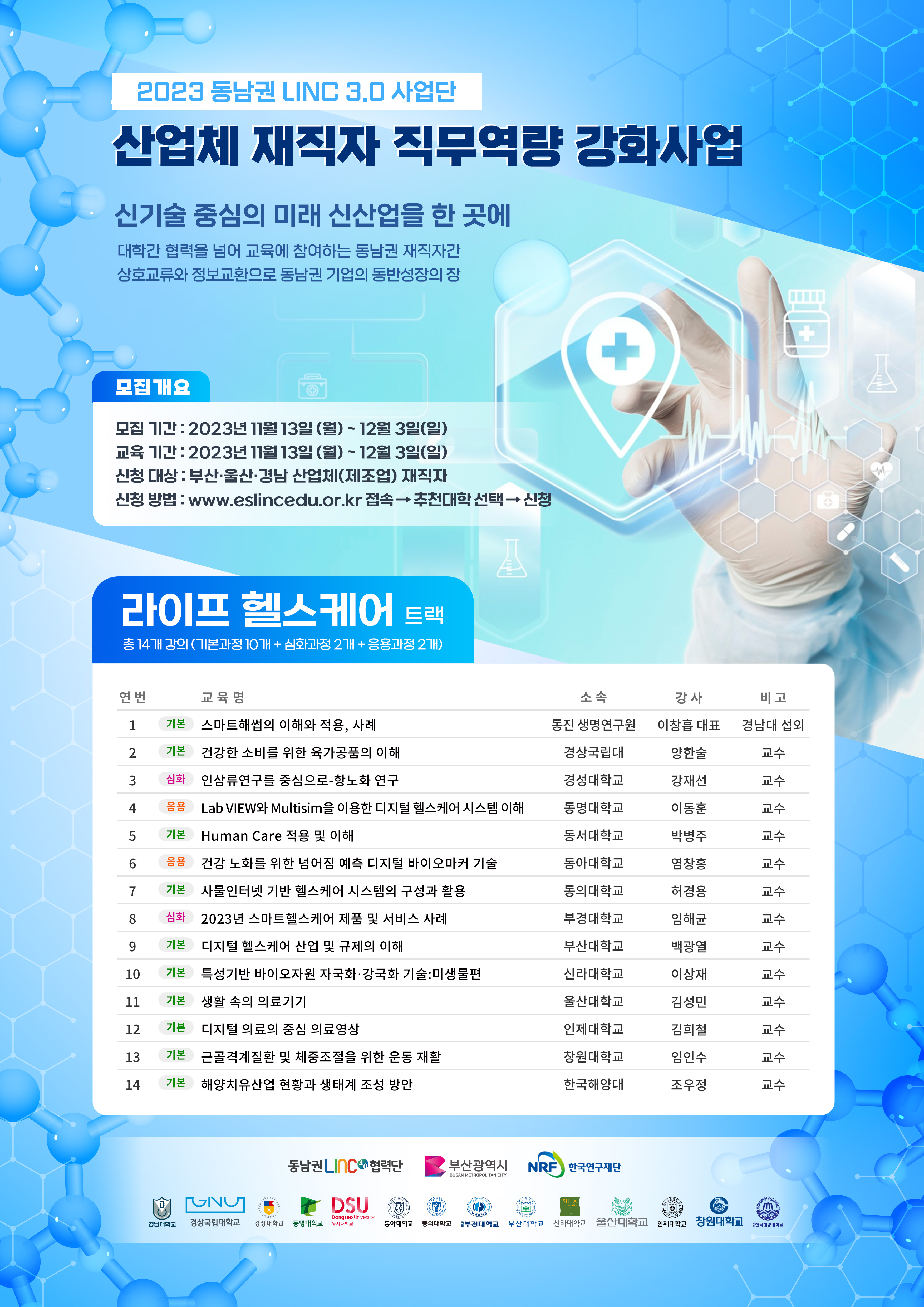 [LINC 3.0 기업지원센터] 동남권 산업체 재직자 직무역량 강화사업 프로그램 안내 (4회차_라이프 헬스케어 트랙)