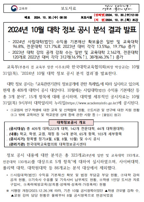 [교육부] 2024년 10월 대학 정보 공시 분석 결과 발표