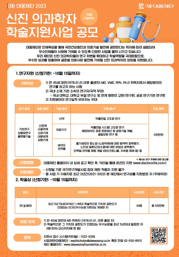 - 사업관련(대웅재단): medischolar@daewoong.co.kr 혹은 전화 02-550-8915