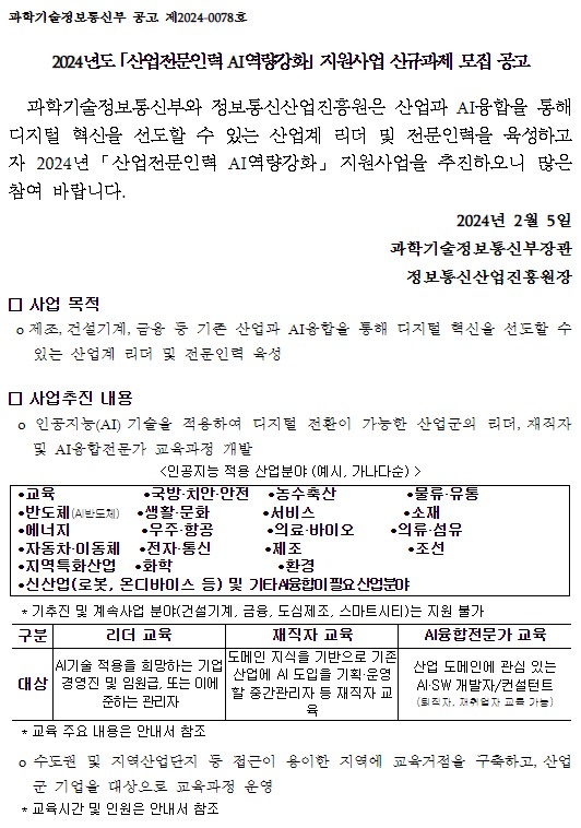 2024년도 산업전문인력 AI역량강화 지원사업 신규과제 모집공고