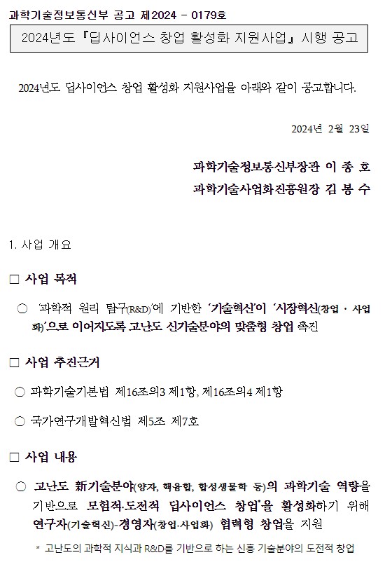 과학기술정보통신부 > 2024년도『딥사이언스 창업 활성화 지원사업』시행 공고